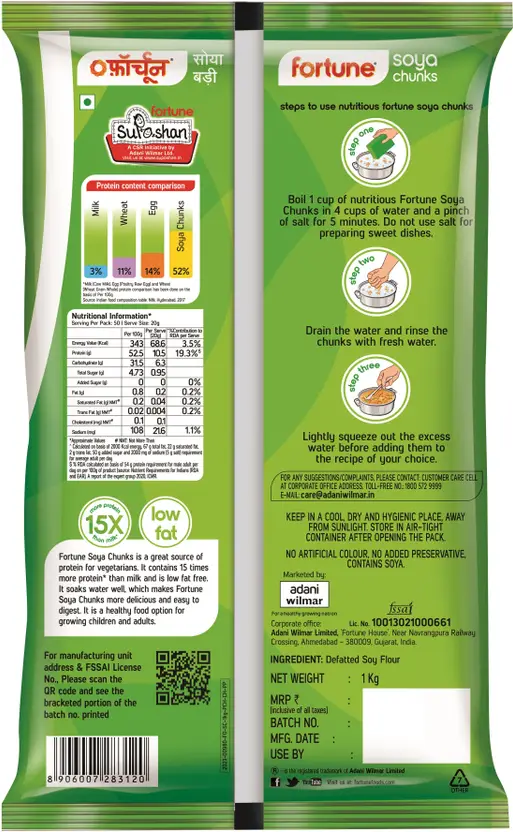 15x times more protein than Milk, 99% fat free and 13% dietary fiber, Super Soakey, Soft and juicy that taste best, Made from world class technology, Untouched by Hands and hygienic, [Commonly Searced: Soya Chunks, soya chunk, soya nuggets, soya badi, soya granules, protein rich soya wadi, soya chunks nutrition]